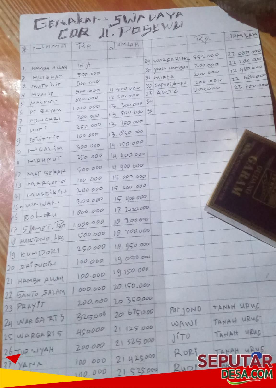 Dengan semangat gotong royong, masyarakat memulai gerakan swadaya “Cor Jalan Posewu”, memperbaiki jalan rusak menggunakan dana dan tenaga sendiri. Warga iuran seikhlasnya, sementara sebagian lainnya menyumbang material seperti tanah urug, pasir, dan semen.