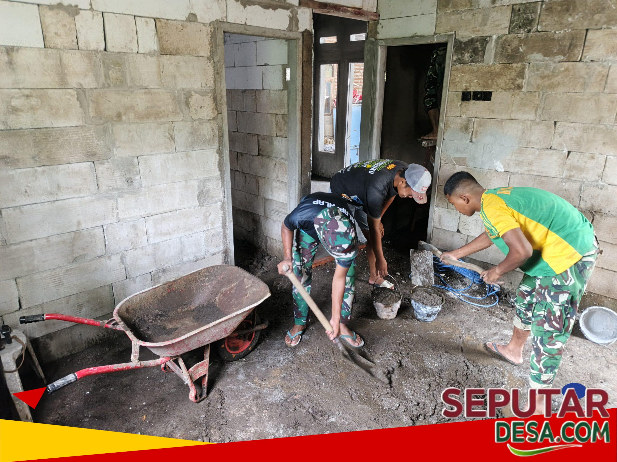 Prajurit dengan seragam kamuflase hijau-kuning khas TNI AD sedang membungkuk di depan gerobak dorong, sementara satu lagi mengayunkan cangkul untuk meratakan adukan semen di lantai. Dinding bata ekspos masih kasar, pintu kayu sederhana terbuka lebar, dan ember-ember berisi adukan berjejer di sekitar mereka. Bau tanah basah dan semen segar memenuhi udara.