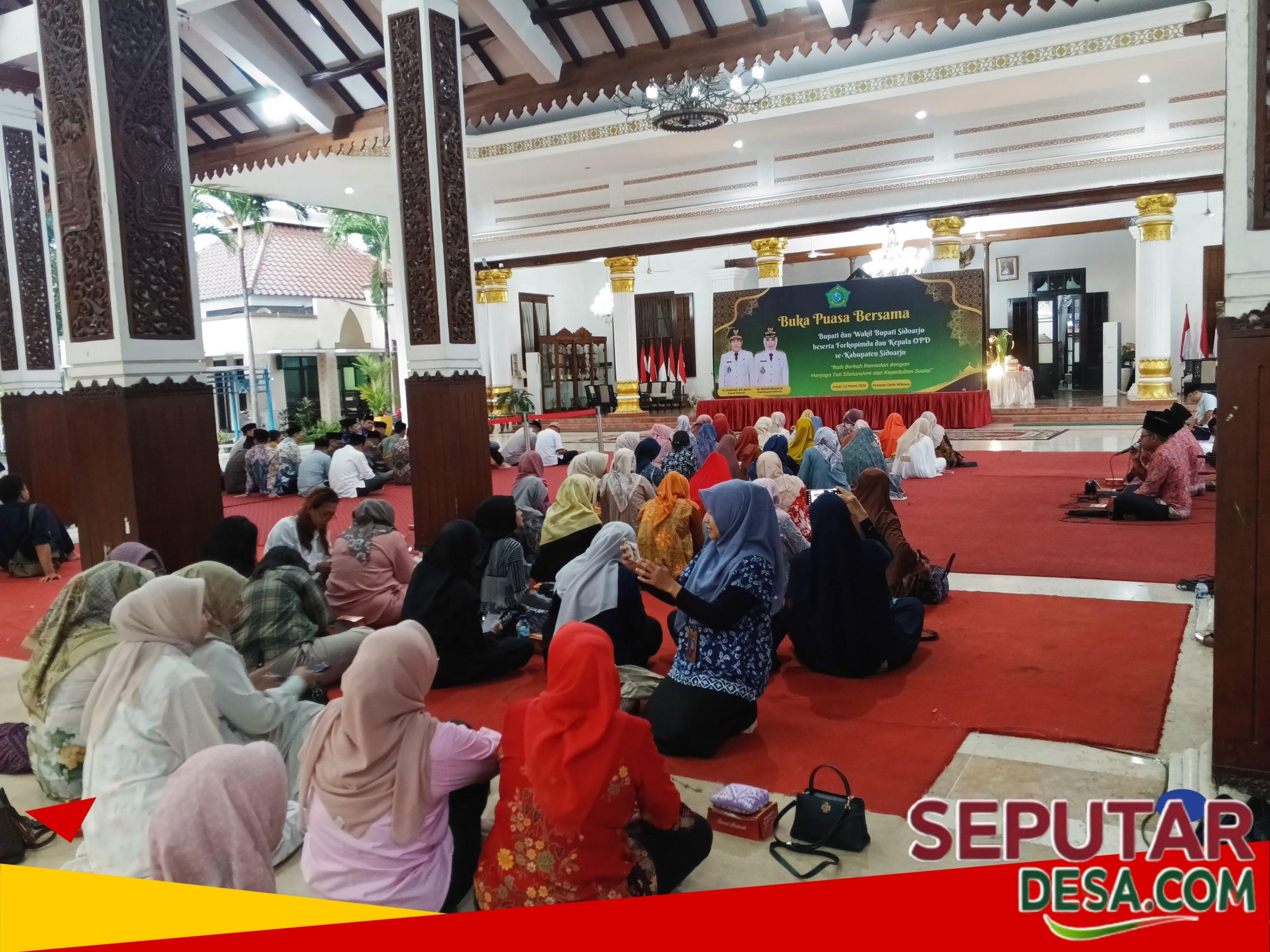 Seputardesa.com, Sidoarjo – Pemerintah Kabupaten Sidoarjo menggelar doa bersama sekaligus buka puasa bersama di Pendopo Delta Wibawa, Jumat (13 Maret 2026). Kegiatan yang berlangsung dalam suasana khidmat dan penuh kebersamaan ini dihadiri Bupati Sidoarjo Subandi, jajaran kepala organisasi perangkat daerah (OPD), Forkopimda, tokoh agama, tokoh masyarakat, wartawan, serta sejumlah pegiat media sosial.