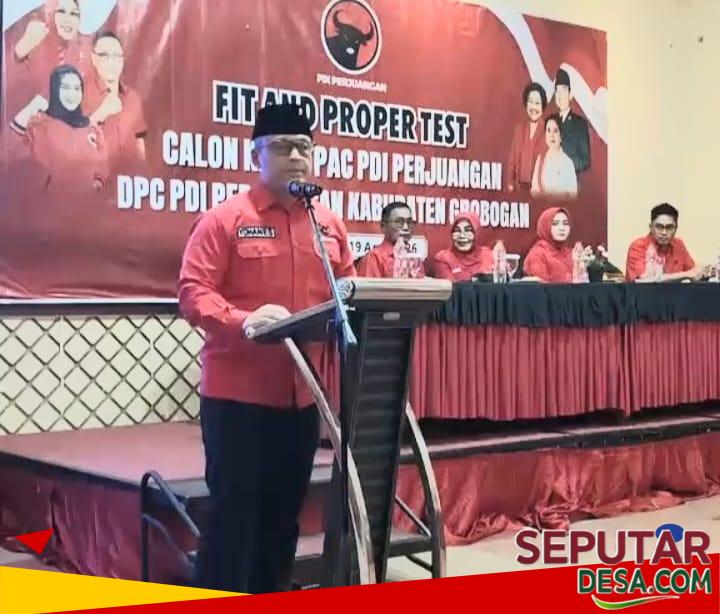 SeputarDesa.com, Grobogan – Dewan Pimpinan Cabang PDI Perjuangan (PDIP) Kabupaten Grobogan bersama DPD PDI Perjuangan Jawa Tengah menggelar fit and proper test bagi calon ketua Pengurus Anak Cabang (PAC) di 19 kecamatan. Kegiatan tersebut berlangsung di Hotel Frontone Purwodadi, Minggu (19/4/2026), sebagai bagian dari upaya konsolidasi dan penguatan struktur partai di tingkat bawah.